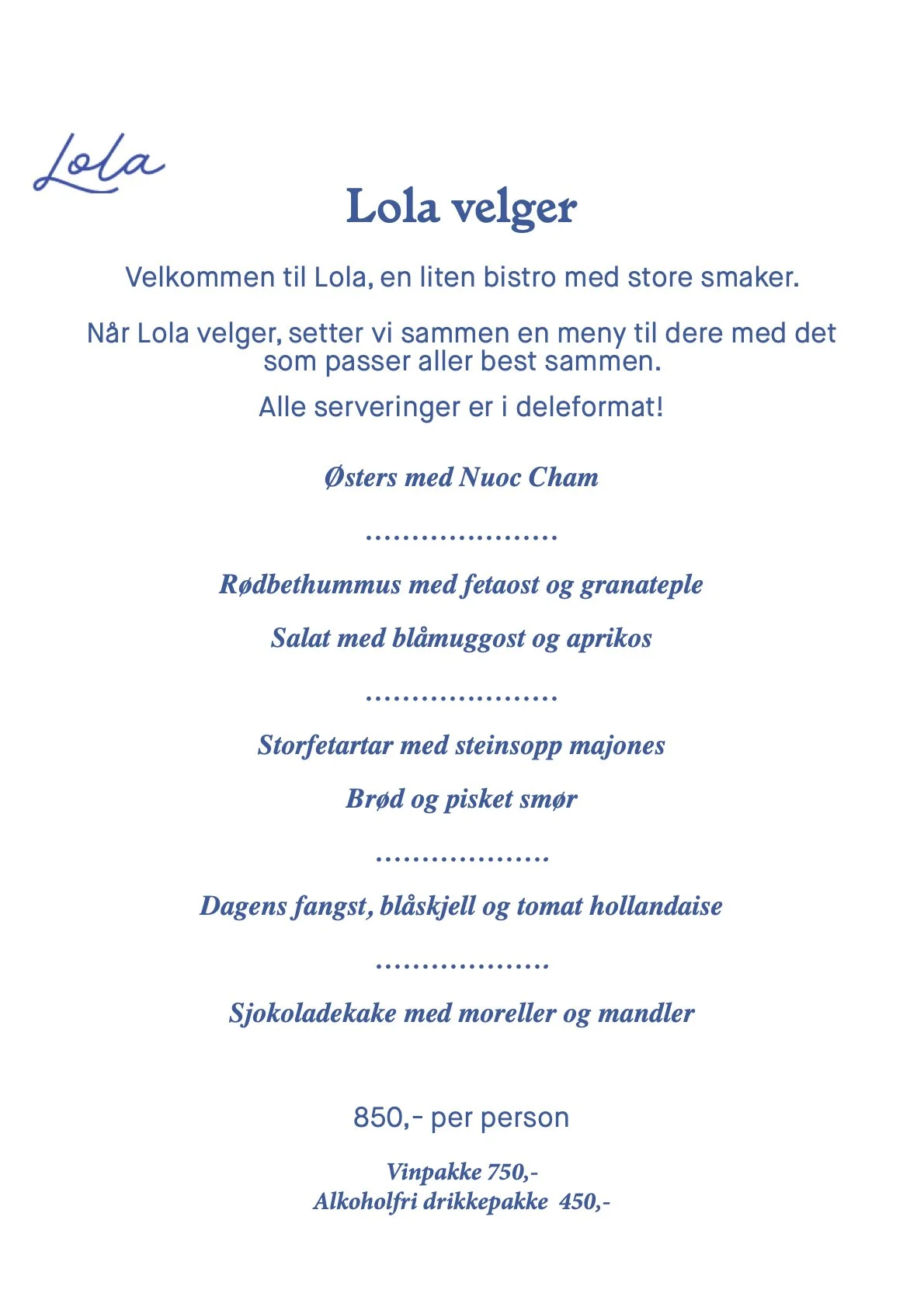 Våre menyer er i stadig endring etter tilgang på råvarer og sesongens nykker. Derfor er menyenene nedenfor eksempelmenyer. Vi kan tilpasse det meste på menyen etter forskjellige allergier og dietter, bare spør oss på mail.